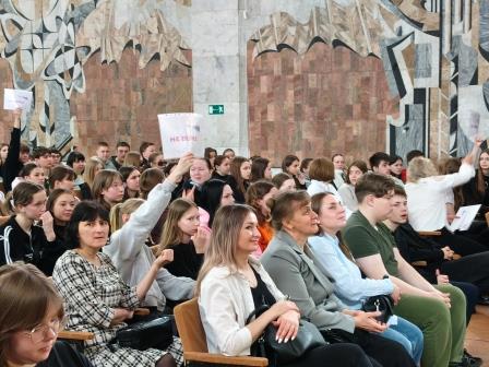 Далее в актовом зале развернулся интерактивный классный час «Верю/Не Верю». Начался он с видеообращения министра образования Нижегородской области М.Ю. Пучкова, а затем прозвучало приветствие директора колледжа Т.В. Ельчаниновой. Заместитель директора по учебной работе Н.В. Смирнова подробно рассказала о многообразии специальностей и профессий, которые открывают двери в успешное будущее. Особый интерес вызвала история выпускницы колледжа Ирмы Соловьевой, которая поделилась своим путем от первокурсницы до ветеринарного врача в АО «Хмелевицы». Представители агрохолдинга «Руслакто» – Елена Мигачева, Яна Зебрина и Екатерина Седулина – подробно рассказали о возможностях заключения целевых договоров, прохождения практики и дальнейшего трудоустройства.